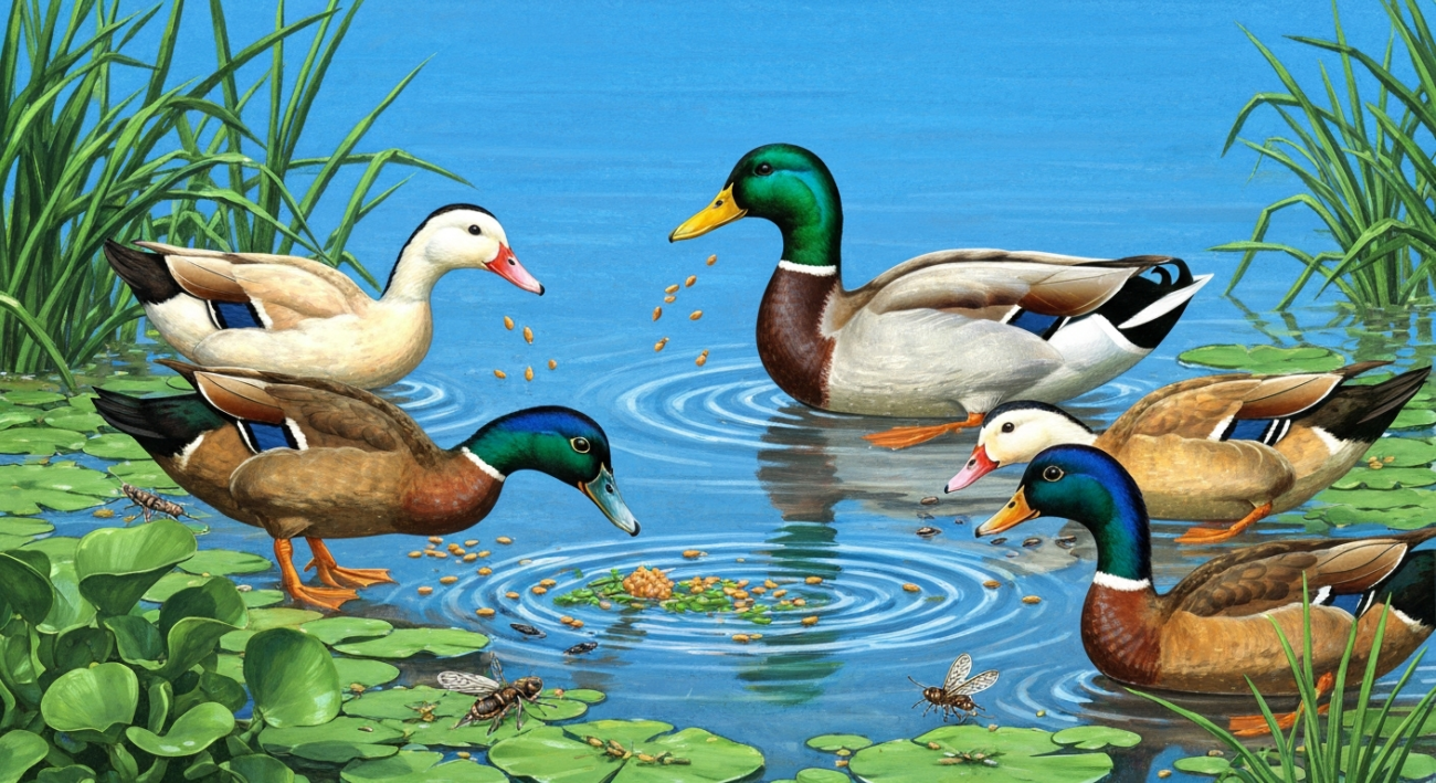 Imagine a group of mallard ducks in a local pond. You might see them ‘dabbling,’ with their heads underwater and their tails up in the air, sifting through the mud for aquatic plants, seeds, and small insects like mosquito larvae. Later, they might waddle onto the grass nearby to graze on fresh clover or pick up spilled grains from a bird feeder. This shows just how varied what do ducks eat can be.