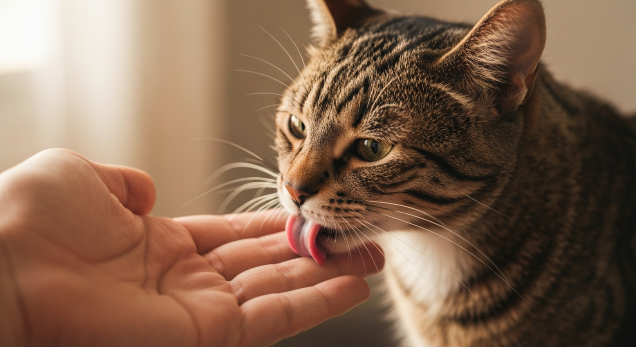 Cats often lick to show love and treat you as a trusted member of their social group, much like they would groom another cat in their family.