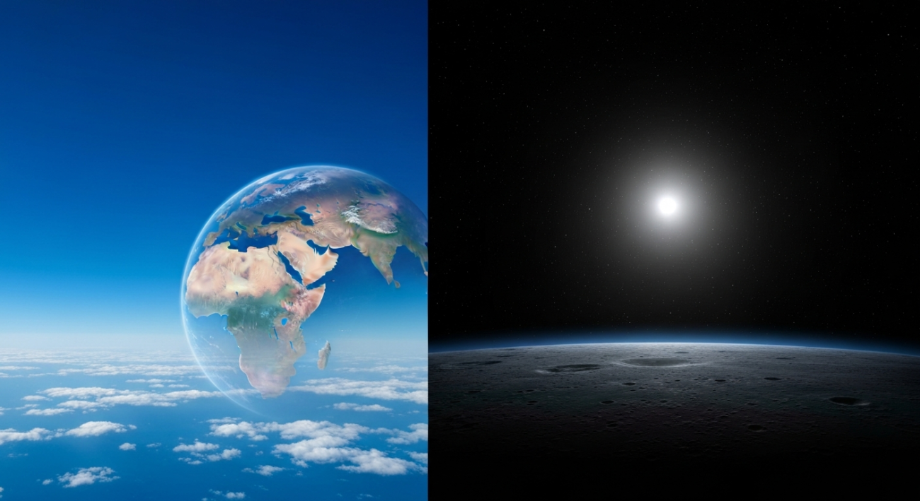 The Earth’s sky appears blue due to the scattering of sunlight by its atmosphere, while the Moon’s sky appears black because it lacks an atmosphere to scatter light.